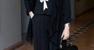 و با استفاده از توربان مشکی، چوکر ساده و بوتهای مشکی، ترکیبی منسجم، رسمی و در عین حال متفاوت ساخت.